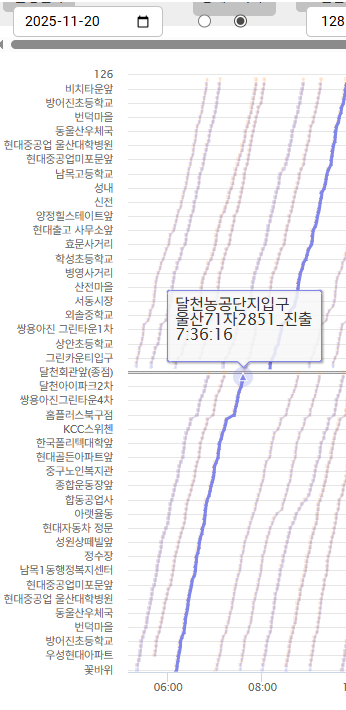 우선 달천 07:35 종점 도착 차량으로 운행기록을 보았을 때는 속도가 많이 느린 차들의 경우 그래프의 기울이가 많이 기울어지는데
