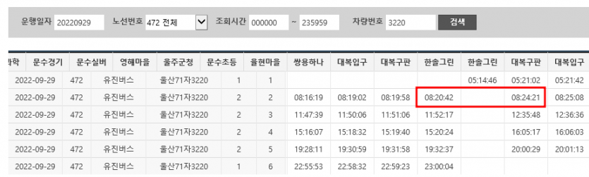 이미 한솔그린빌에 도착한 시간이 시간표상 출발시간보다 늦게 도착하여 부득이하게 배차시간을 준수할 수 없었다는 점 안내해드립니다.