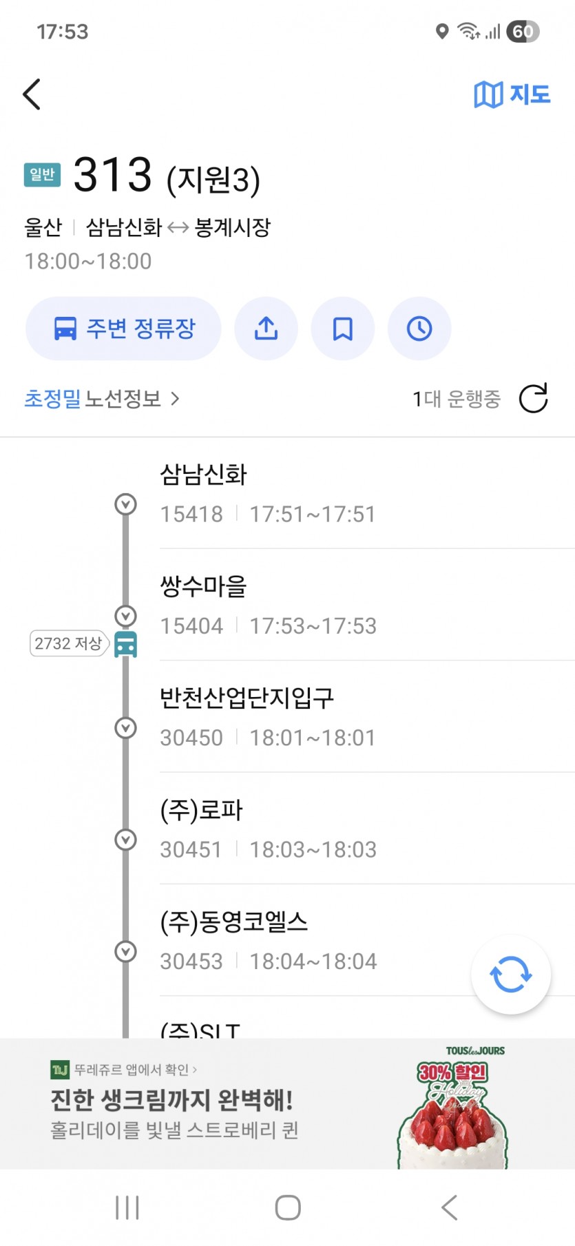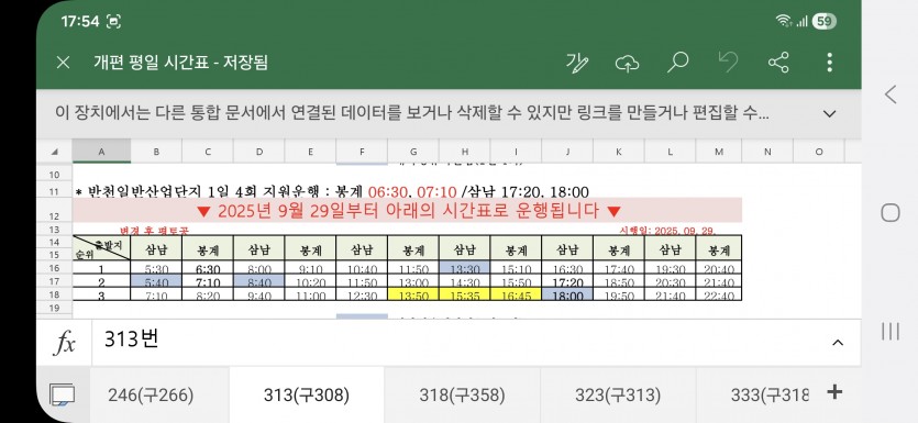 18시에 삼남신화차고지에서 출발해야하는 313번 버스(반천산업단지 지원운행)가 17시 53분에 쌍수마을을 통과하는데, 분명히 조합 홈페이지의 시간표에도 삼남신화에서 18시에 출발하는 걸로 되어있습니다