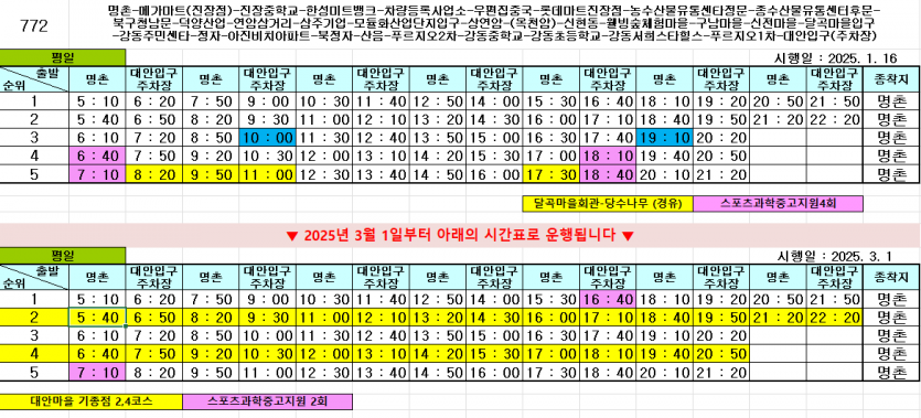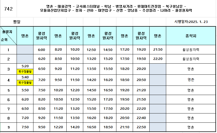 작성하신 출발시간이 각 노선번호에 없어 내용 파악이 어렵습니다.