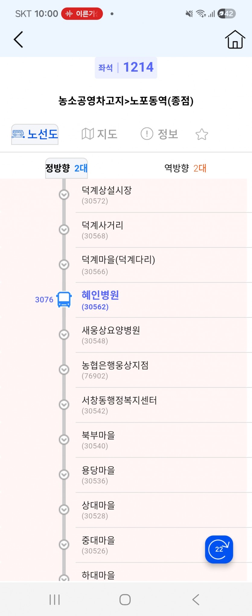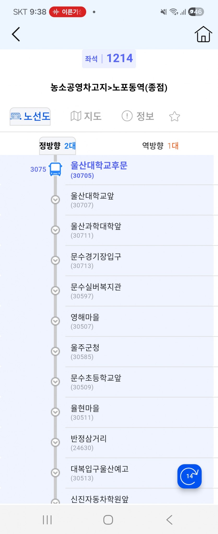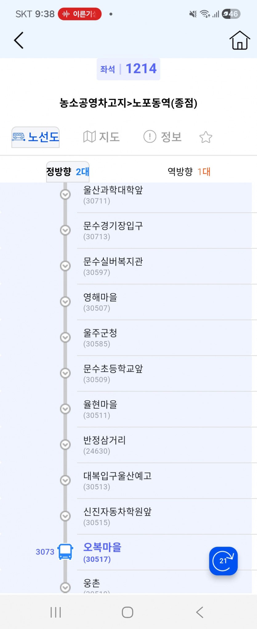 정말 참다참다 이글 올립니다. 7/5일 개편으로 인하여 1214번이 농소에서 매곡,달천,동천서로,장현동으로 바뀌니 빨리가도 2시간이나 걸립니다. 퇴근시간이 걸리면 2시간 30분에서 3시간 30분까지 걸립니다. 432같은건 왕복 3시간인데 1214는 편도가 3시간이니까 너무 결행이 많습니다. 오늘 1214번 BIS를 들어갔는데 차가 사라졌다가 없어졌다 합니다. 오늘 시간표를 대조하니 농소로 들어갈때 3072가 첫차고, 3073이 막차였습니다. 3073전에 차에 3077만 있고, 3076,3075는 어디로 갔는지 행방불명이였습니다. 아직도(21시 45분경) 3076은 나오지 않고 있고 이 사진처럼 3073이 앞에 있습니다. 12월 20~30일경(토요일,일요일) 3075가 옥동 공원묘지앞에 있는 이예로에서 나와 울산대쪽으로 좌회전하는 것을 목격했습니다. 그리고 나서 바로 BIS를 켜고 버스정보앱에도 나오니 운행을 시작한것 같습니다. 이게 맞나요? 다른데는 타지 말라는 건가요? 오늘도 이예로 타고 빠졌는 것으로 추정됩니다. 저는 1214번 감시할겁니다. 1214번 노선을 편도 1시간30분에서 2시간짜리로 바꿔줬으면 합니다. 노선이 너무 기니까 법원까지 이예로 타고 내려오는것 같습니다. 1214번 노선 이탈하지 않는 그날까지 기원하겠습니다. +제가 이것을 적는 중에 3076이 뜨네요(노포동갈때는 안뜸).... +이것에 대한 입장을 적어주시면 좋겠습니다.
