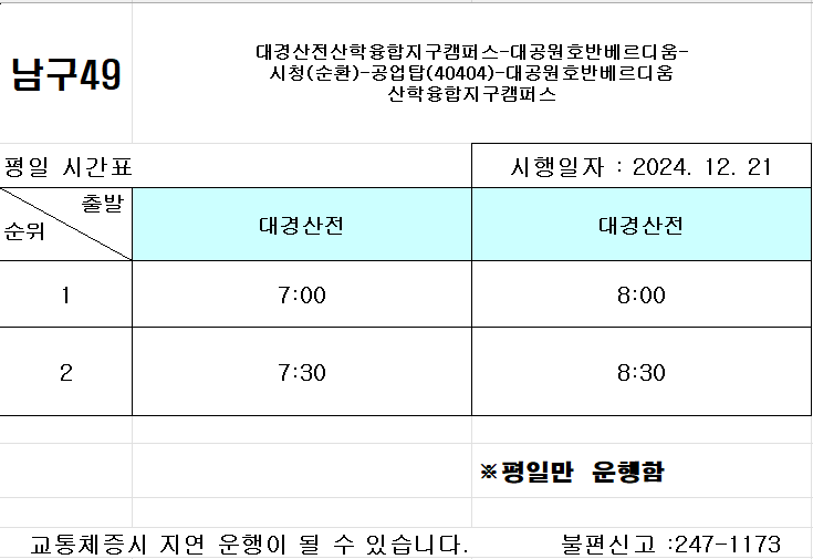 이용에 불편을 드린 점 사과드리며, 기타 노선개편과 관련한 건의사항은 052-120으로, 시간 문의 및 노선 문의는 223-9561로 연락 부탁드립니다.