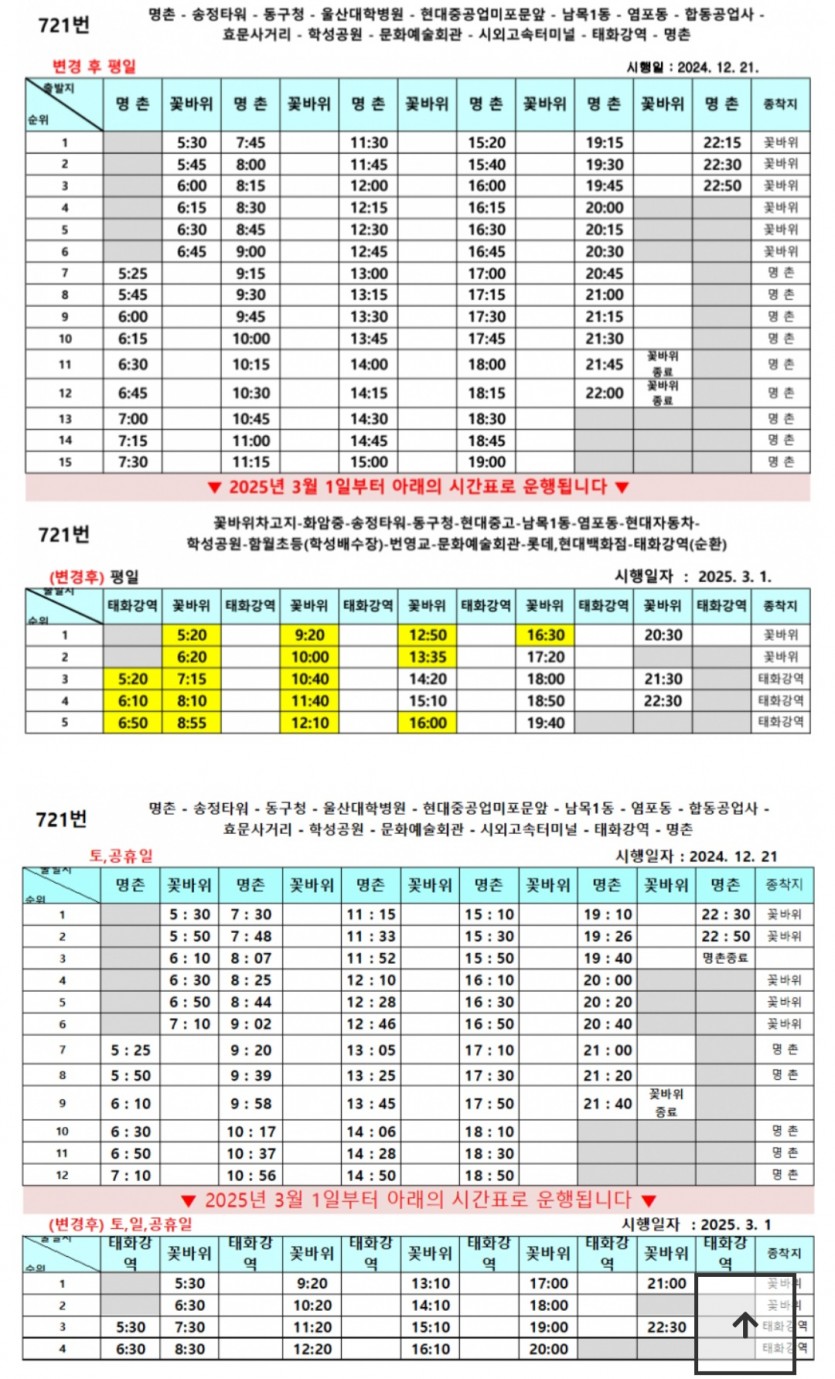 가능하시다면 이번에 시간표가 변경됀 721번 노선을 이용하여 노선변경을 고려 해 주셨으면 좋겠습니다.