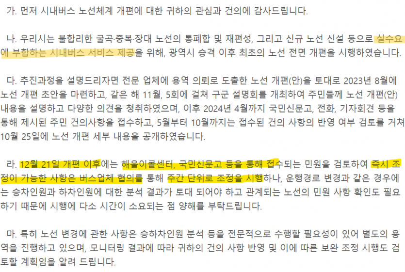 1. 울산시가 "불합리한 굴곡/중복/장대 노선의 통폐합 및 재편성, 신규 노선 신설 등에 부합하는 시내버스 서비스 제공~ " 이 부분에서, 불합리라는 표현은 맞지 않는 것 같습니다.