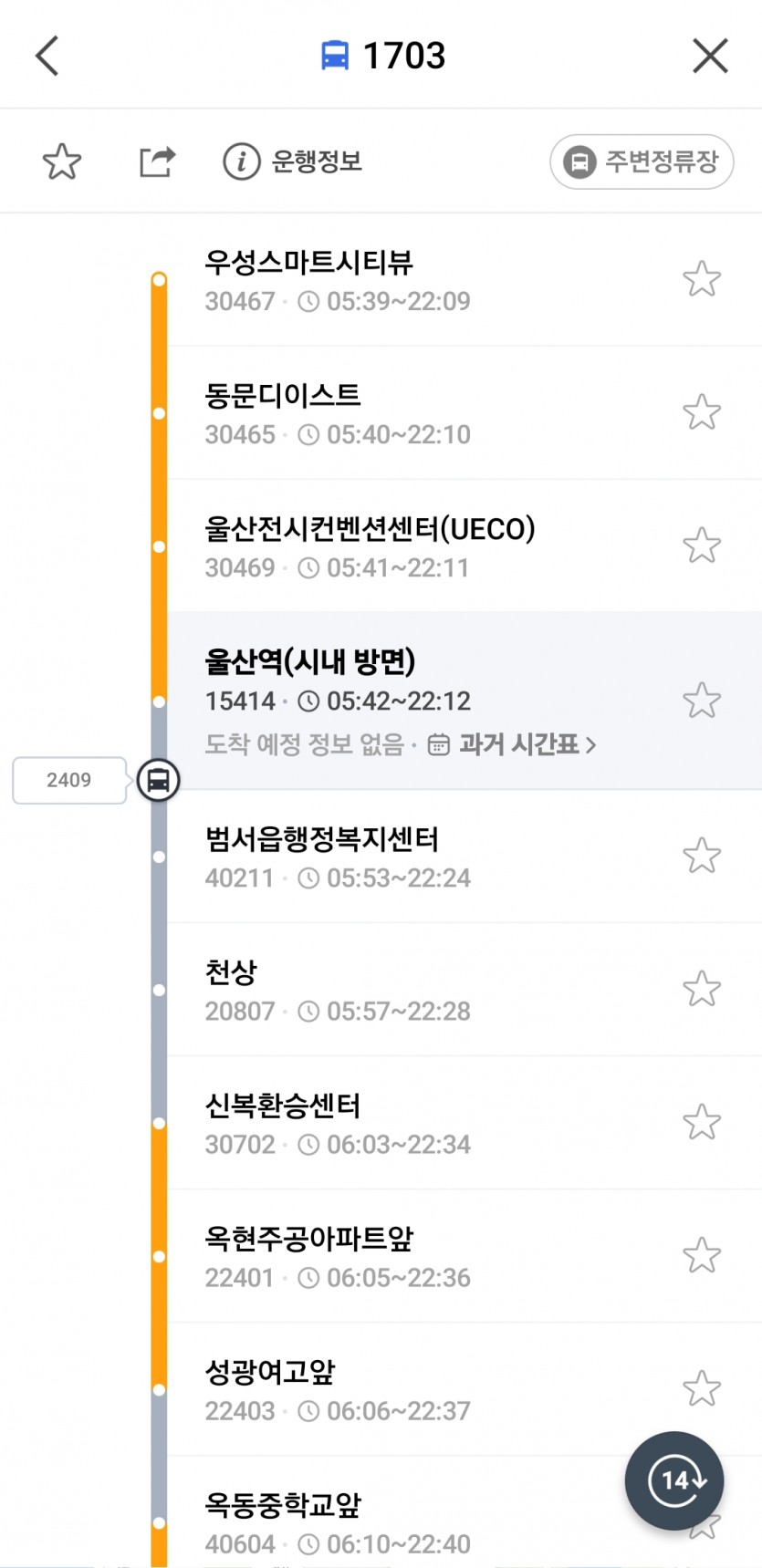 시내방향 울산역 정류소에서 1703번 버스 타려고 기다리고 있다가