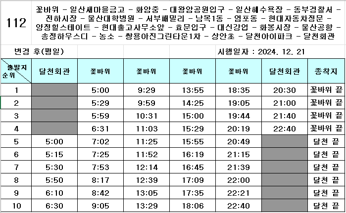 작성하신 내용과 관련하여 운행시간표를 확인해 본 결과, 112번 노선은 약 30분 간격으로 운행되고 있습니다.