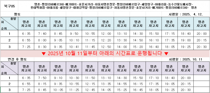 북구05 운행시간이 10월 11일부터 변경되었습니다. 10:05 과 10:30 시간이 있으니 참고하시기 바랍니다.