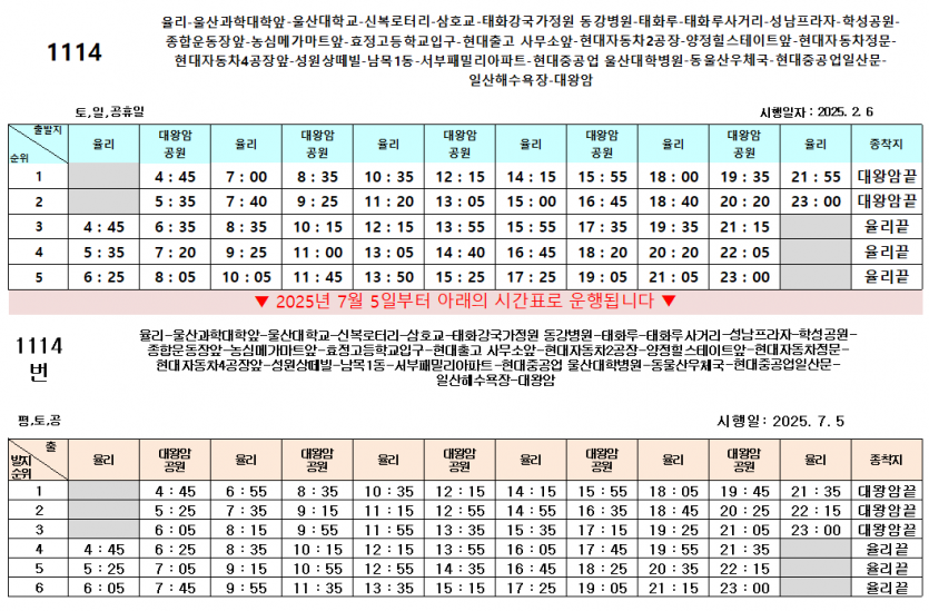 불편 Re: 토요일 13시55분 율리출발 1114번 운행 안하나요?