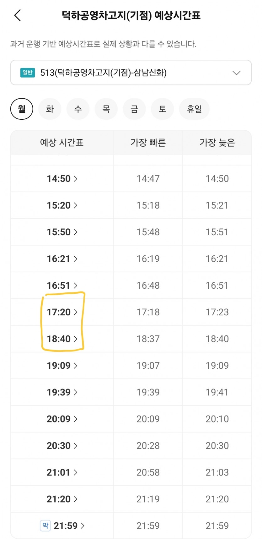 2. 덕하에서 출발하는 513 버스의 도착시간이 너무 제각각이다. 퇴근시간인걸 감안해도 꾸준히 늦는 것도 아니고 너무 들쭉날쭉입니다.
