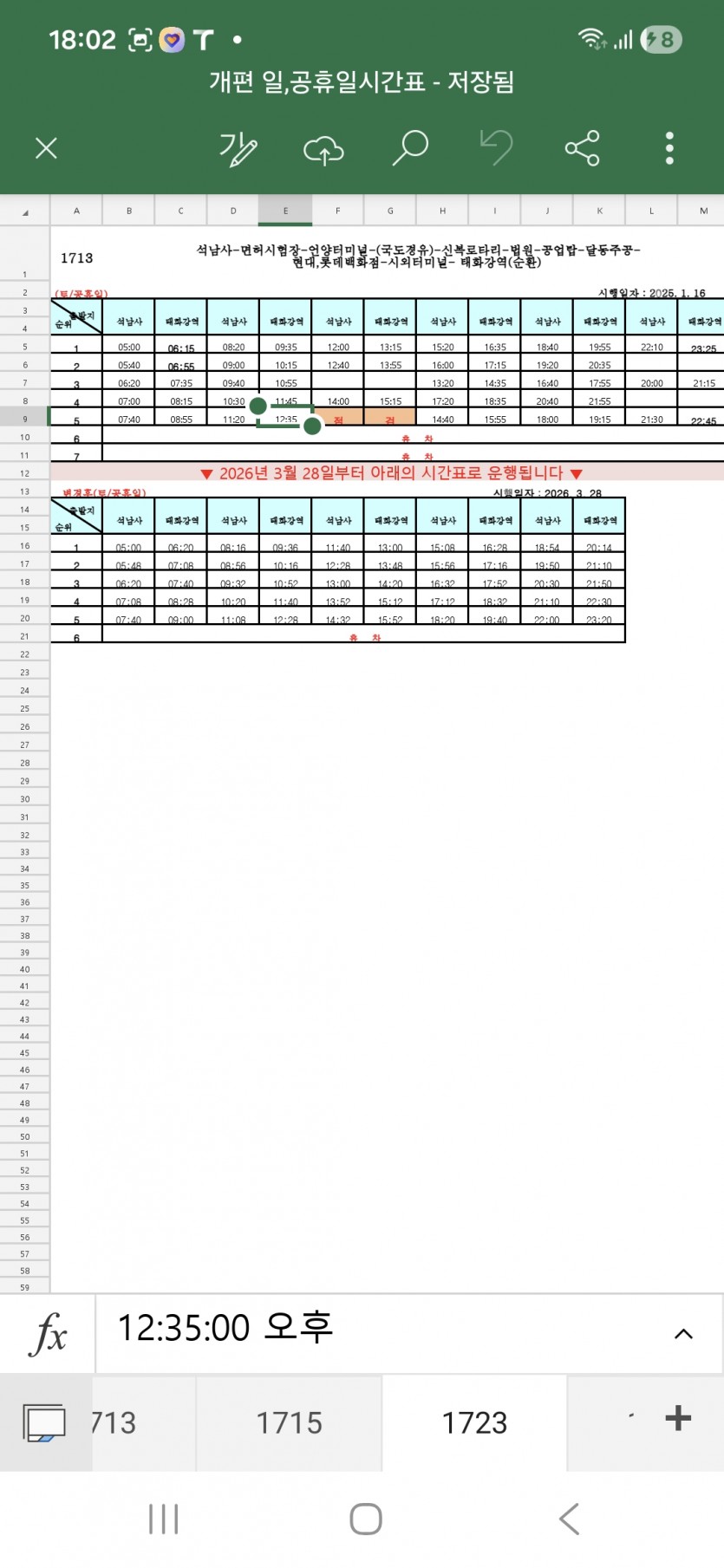1723번 일요일, 공휴일 시간표에 1713번 시간표가 올라가있고 1733번 시간표에는 종점이 석남사라고 적혀있습니다