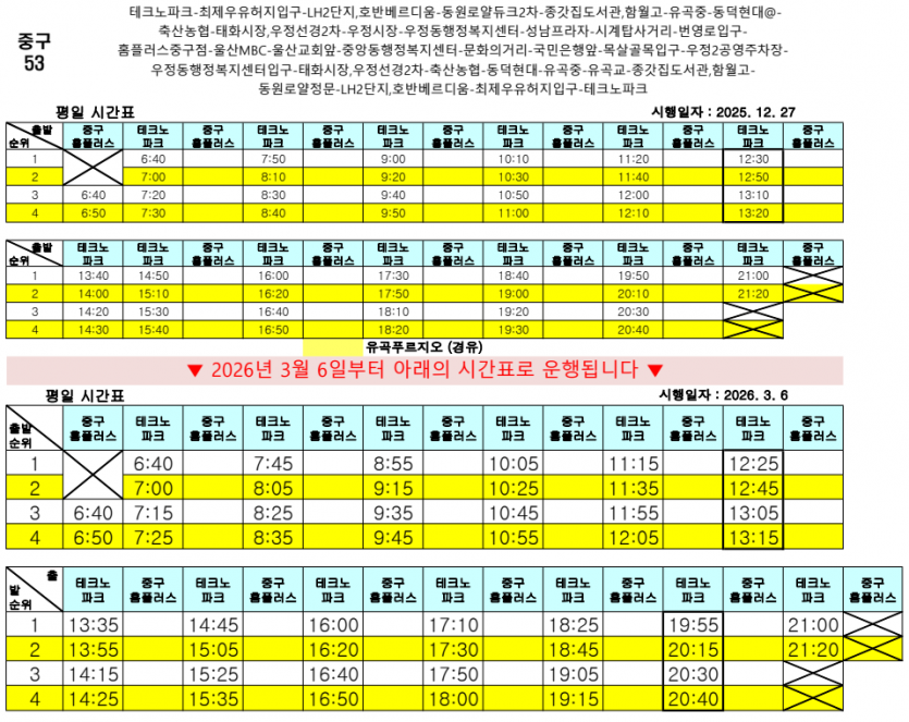 시간변경 2026년 3월 6일부터 중구53번 운행 시간이 변경됩니다.