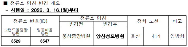 정류소 2026년 3월 16일부터 웅상중앙병원 정류소 명칭이 양산성모병원으로 변경됩니다. 페이지 정보 작성자 최고관리자 (114.♡.215.204) 조회Hit 79회 작성일Date 26-03-13 11:02 본문 목록 다음글2026년 3월 14일부터 울주13번이 사광 정류소에 추가 정차하며, 명촌마을회관 정류소가 신설됩니다. 26.03.13