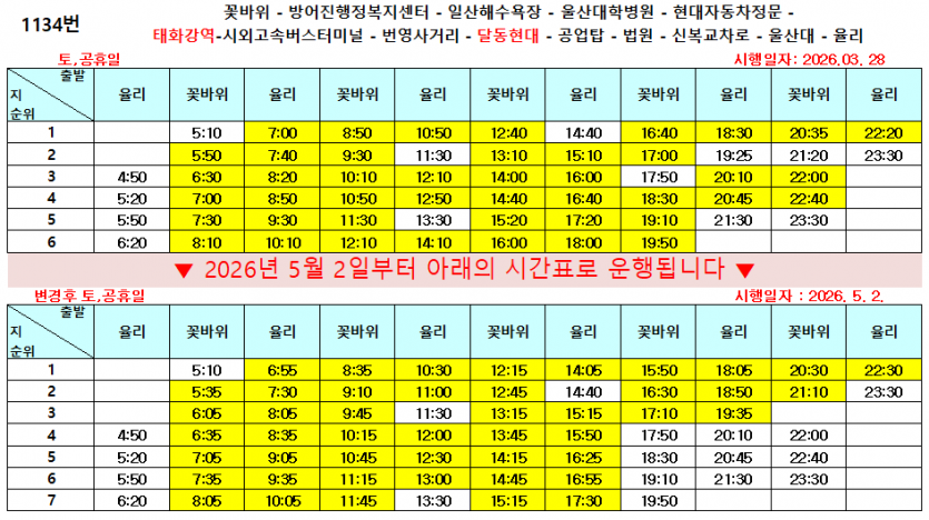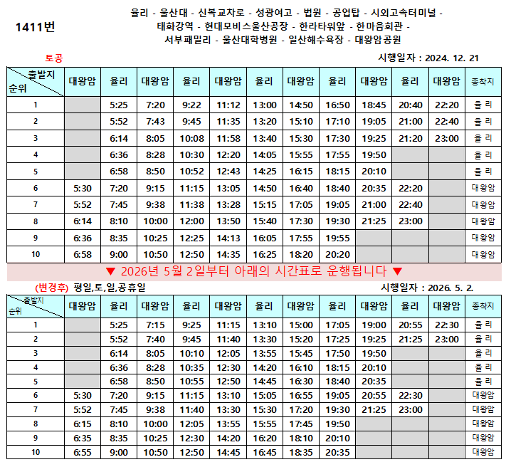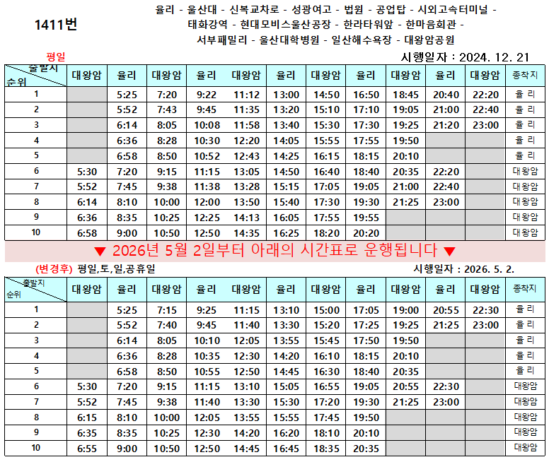시간변경 2026년 5월 2일부터 472번, 1134번, 1411번, 5001번 운행 시간이 변경됩니다.
