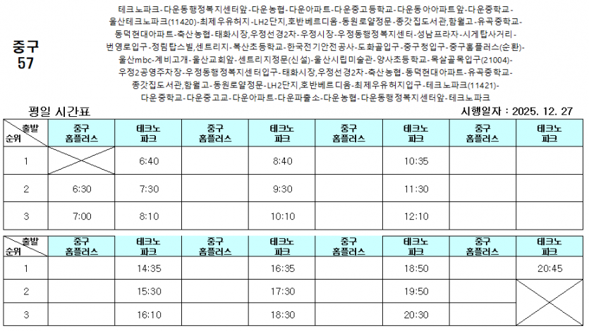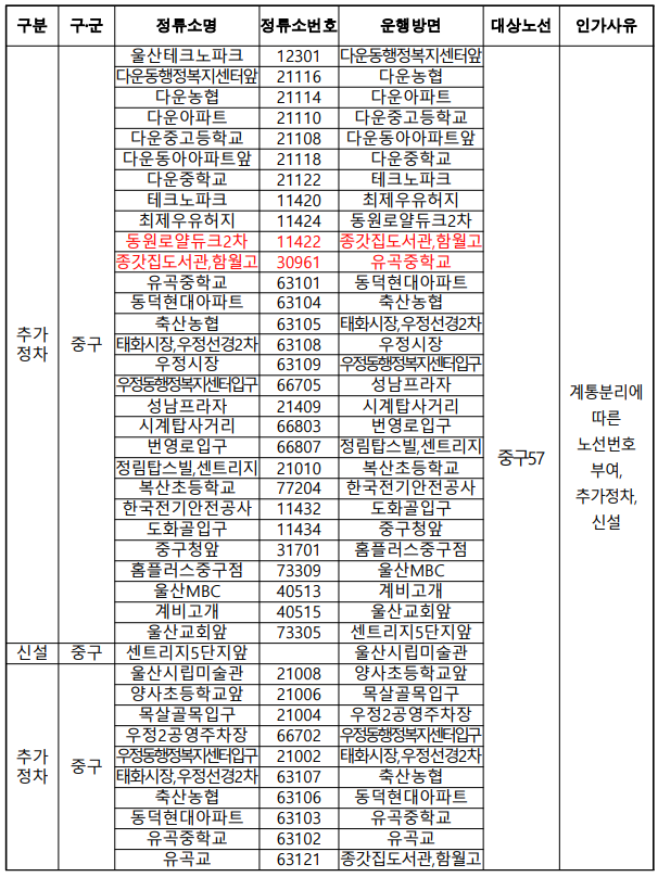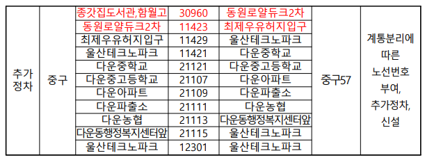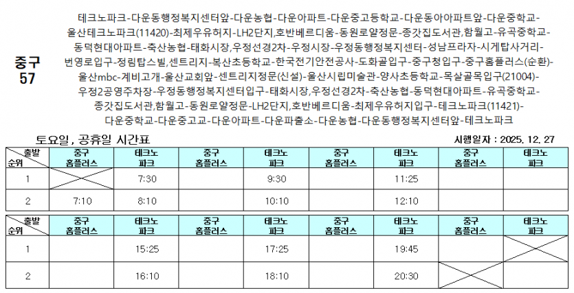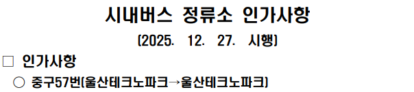 노선변경,신설,폐지 2025년 12월 27일부터 중구57번 노선이 신설됩니다.