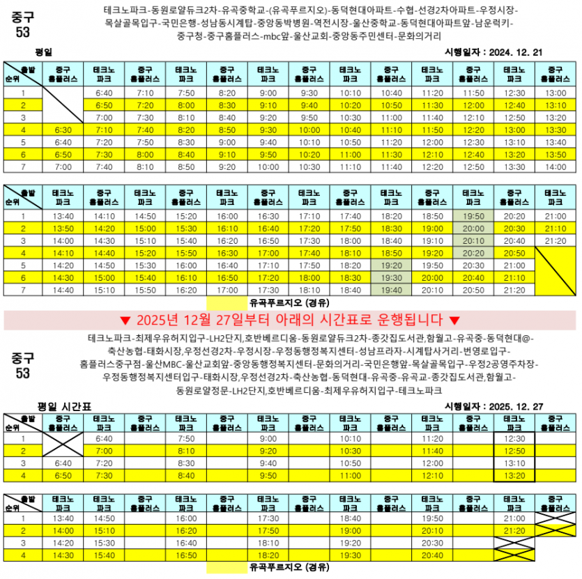 시간변경 2025년 12월 27일부터 중구53번 운행시간이 변경됩니다.
