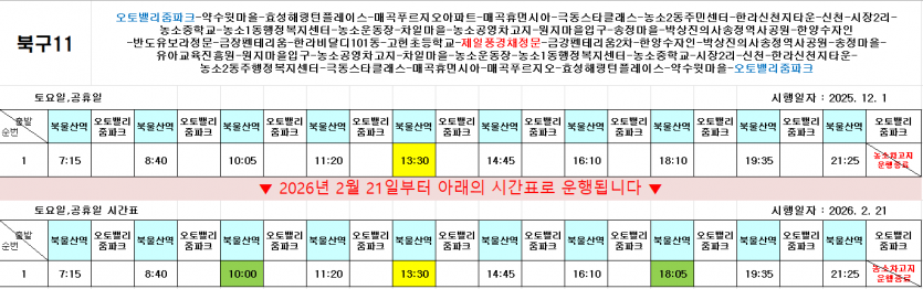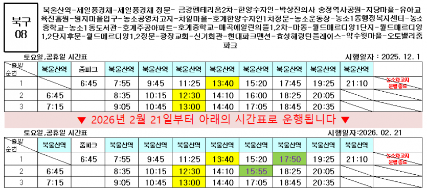 시간변경 2026년 2월 21일부터 북구02번, 북구08번, 북구11번 운행 시간이 변경됩니다.