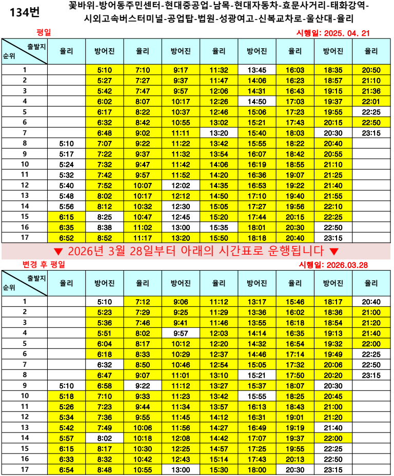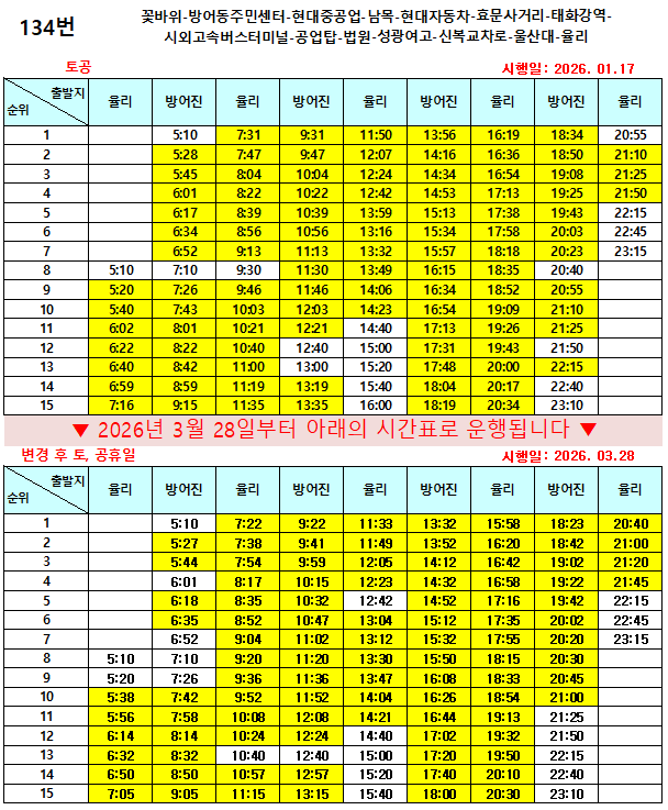 시간변경 2026년 3월 28일부터 134번 운행시간이 변경됩니다.