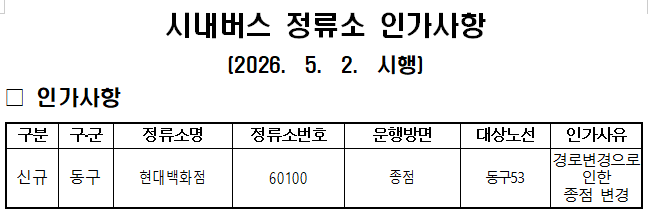 노선변경,신설,폐지 2026년 5월 2일부터 동구53 종점이 연장됩니다.