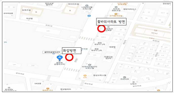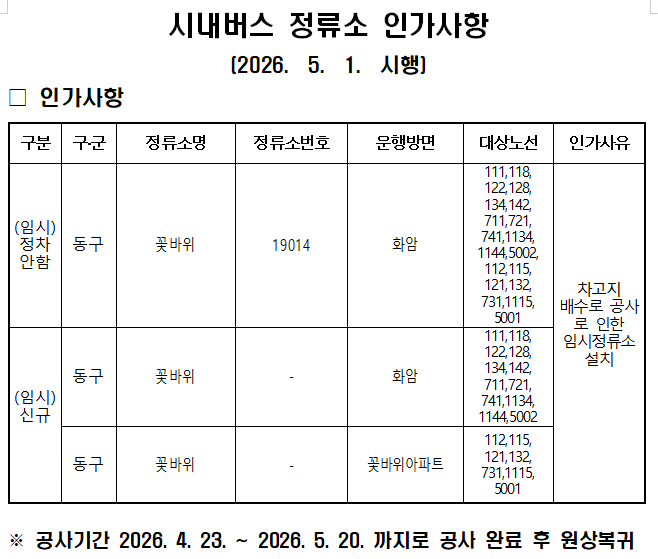 정류소 2026년 5월 1일 ~ 5월 20일 동안 공사로 인해 꽃바위 정류소가 임시 이전됩니다.