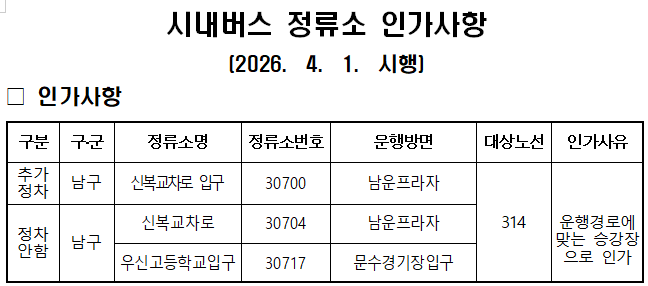 노선변경,신설,폐지 2026년 4월 1일부터 314번 정차 정류소가 변경됩니다. 페이지 정보 작성자 최고관리자 (114.♡.215.204) 조회Hit 386회 작성일Date 26-03-31 15:21 본문 목록 게시판 리스트 옵션 검색 닫기 다음글2026년 3월 28일부터 1703번 노선이 폐지됩니다. 26.03.27