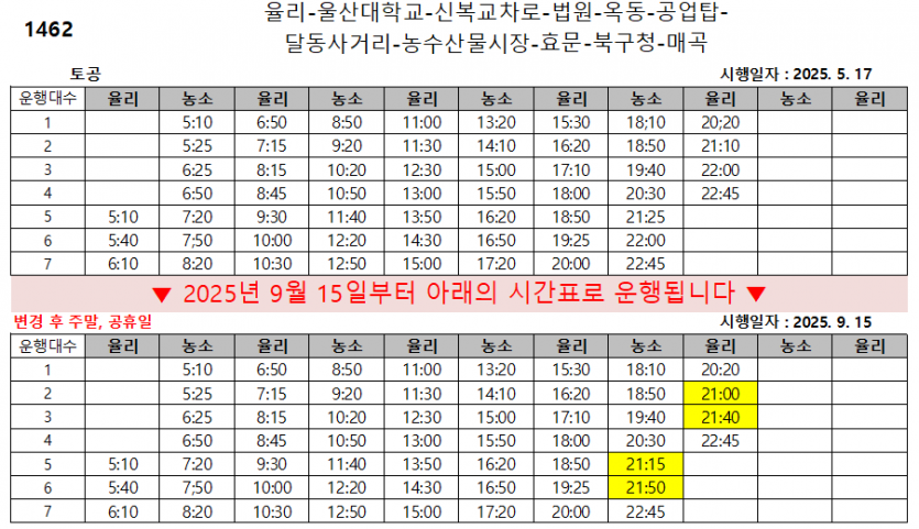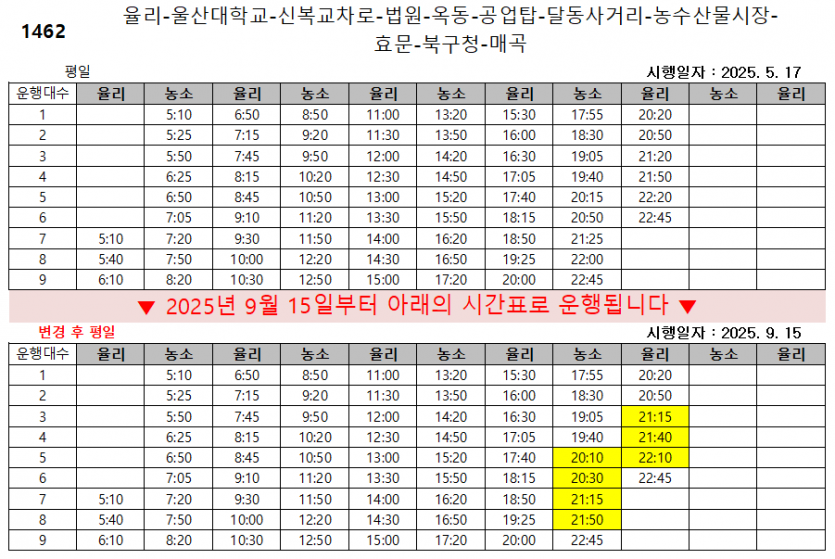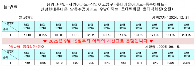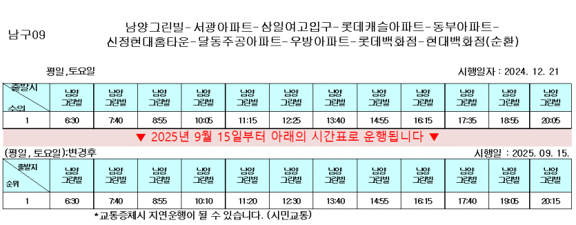 시간변경 2025년 9월 15일부터 1462번, 남구09번 운행 시간이 변경됩니다.