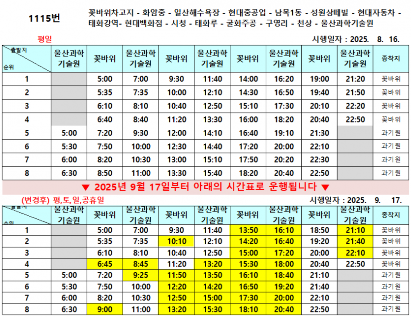 시간변경 2025년 9월 17일부터 1115번 운행 시간이 변경됩니다.