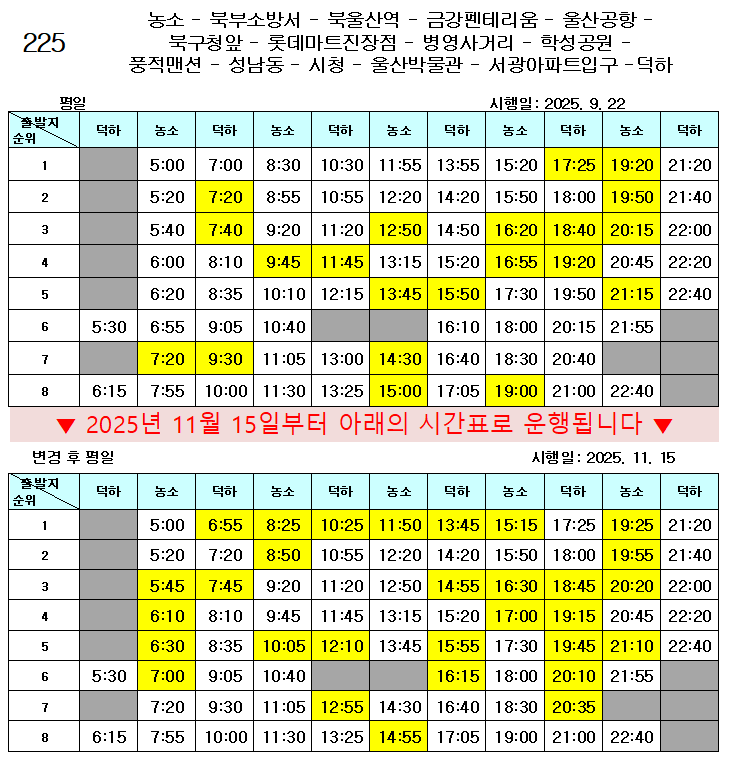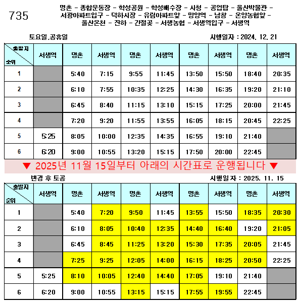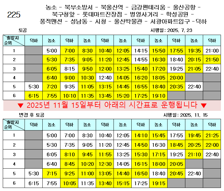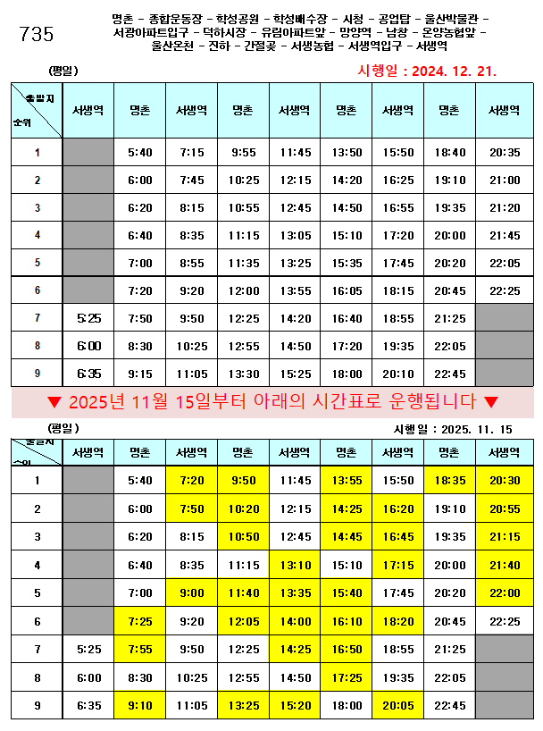 시간변경 2025년 11월 15일부터 225번, 735번, 754번 운행 시간이 변경됩니다.