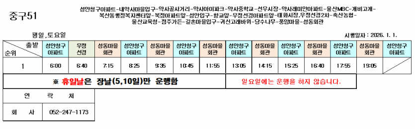 시간변경 2026년 1월 1일부터 중구51번 운행 시간이 변경됩니다. 페이지 정보 작성자 최고관리자 (114.♡.215.204) 조회Hit 264회 작성일Date 25-12-30 11:05 본문 목록 게시판 리스트 옵션 검색 닫기 다음글2025년 12월 27일부터 중구53번 운행시간이 변경됩니다. 25.12.19