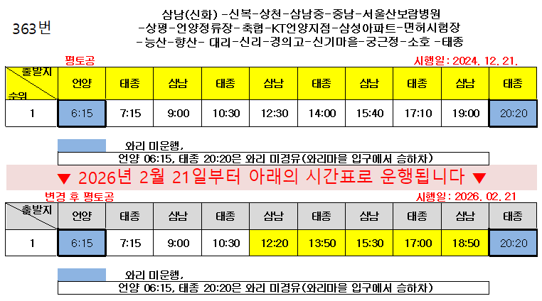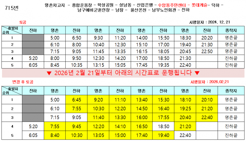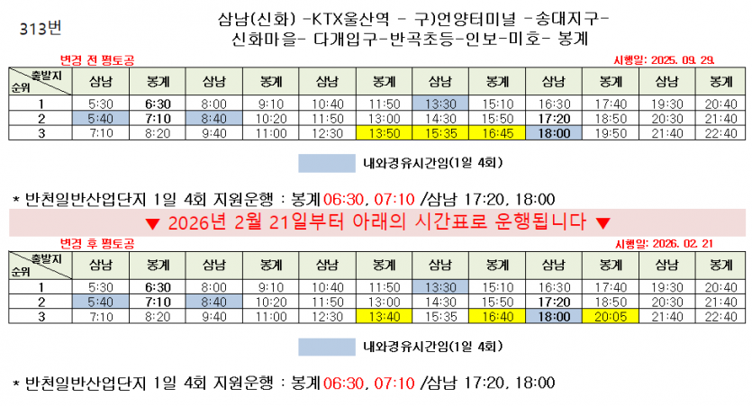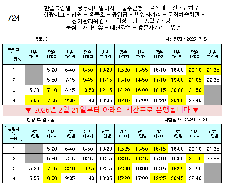- 다음글2026년 2월 7일부터 울주64번 운행 시간이 변경됩니다. 26.02.03