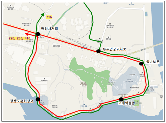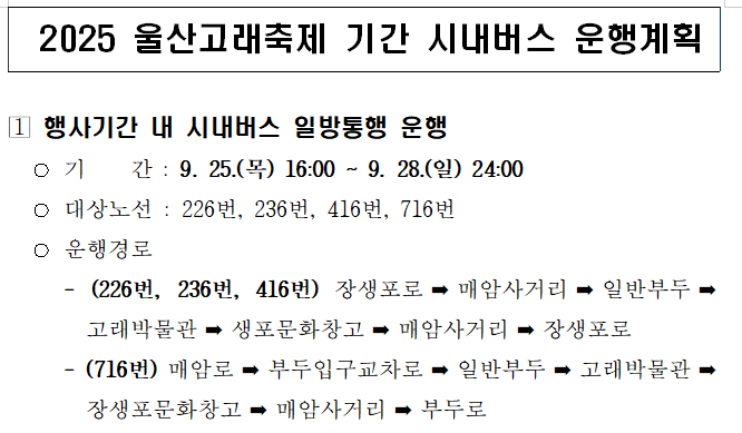 알림 2025년 9월 25일 ~ 28일 동안 고래 축제로 시내버스 운행 경로가 변경됩니다.