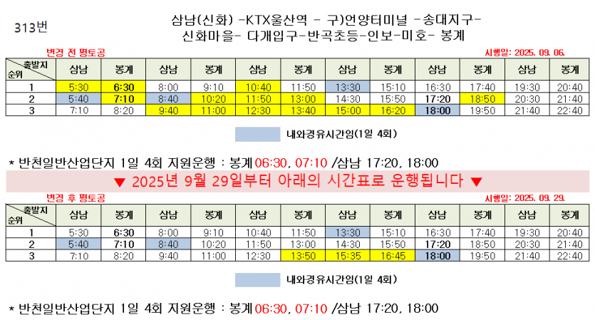 시간변경 2025년 9월 29일부터 313번 운행 시간이 변경됩니다.
