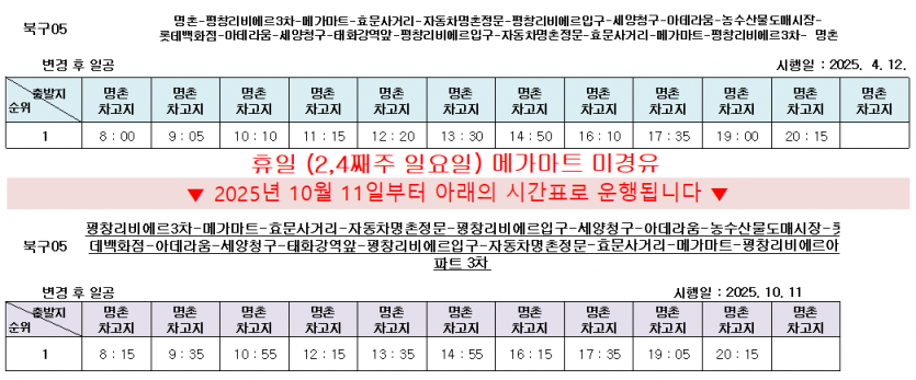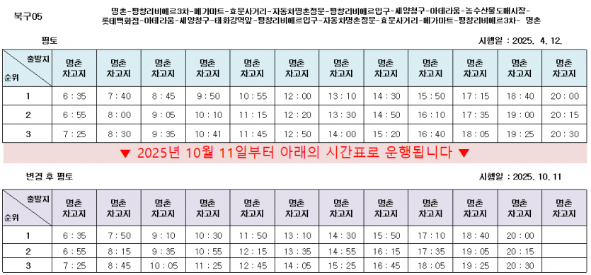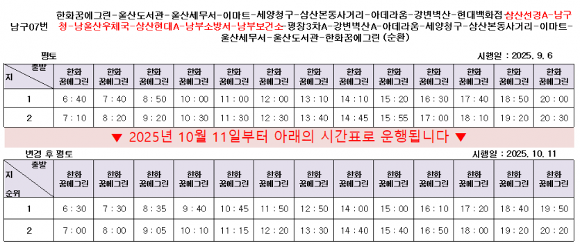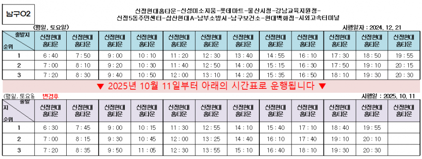 시간변경 2025년 10월 11일부터 남구02번, 남구07번, 북구05번 운행 시간이 변경됩니다.