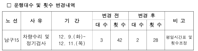 알림 2025년 12월 9일 ~ 11일 동안 남구15번이 차량 수리로 운행시간이 변경됩니다.
