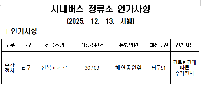 노선변경,신설,폐지 2025년 12월 13일부터 남구51번이 신복교차로 정류장에 추가정차 합니다.