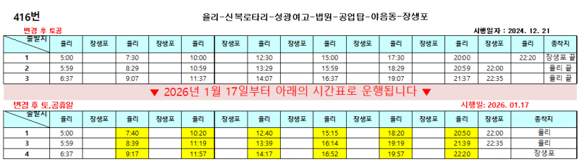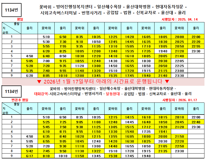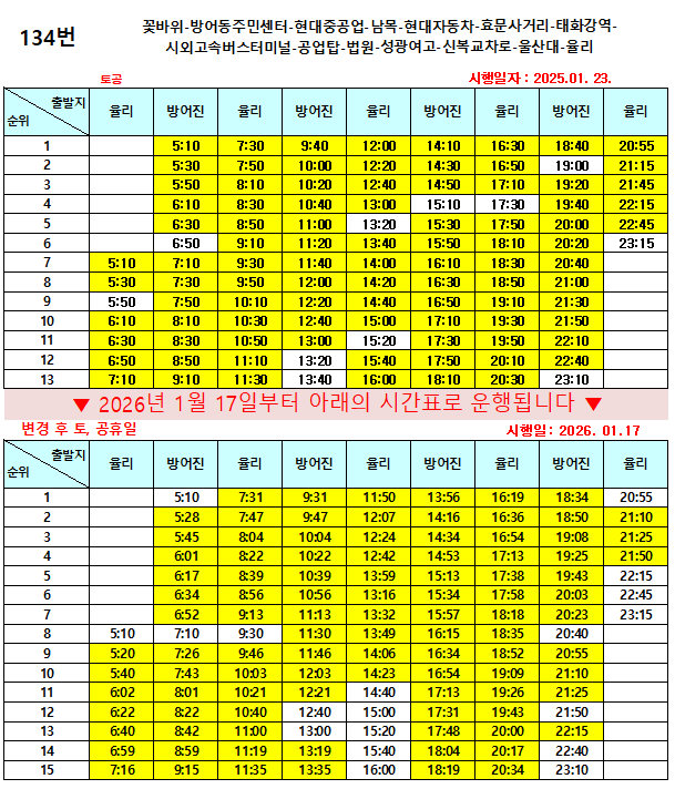 시간변경 2026년 1월 17일부터 134번, 318번, 416번, 713번, 918번, 1134번 운행 시간이 변경됩니다.