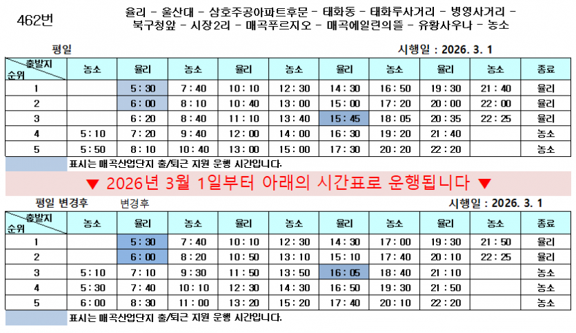 시간변경 2026년 3월 1일부터 215번, 462번 운행 시간이 변경됩니다.