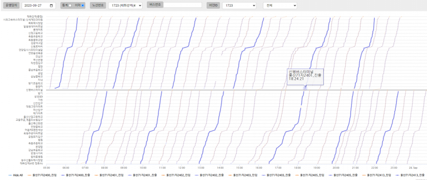 2023-09-27(수) 해당 날짜는 명절 전날로, 오후 3시부터 전체적으로 교통체증이 매우 심하여 차량들이 도중운행 및 지연, 연발 및 결행까지 매우 잦았던 날이었습니다.