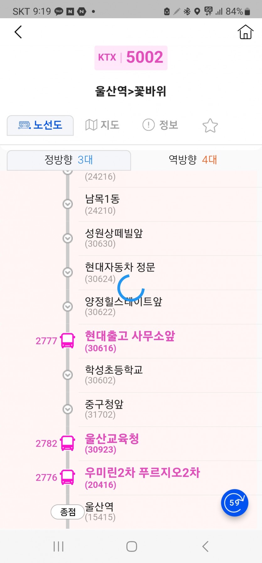 불편 9월22일 07시50분 꽃바위 출발 울산역 방면 5002번버스