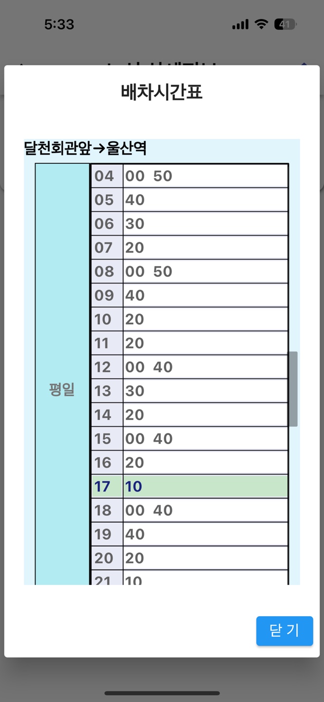 작성하신 내용을 바탕으로 확인해 본 결과, 버스어플 구버전과 신버전 모두 달천회관에서 출발 시간이 06:30 으로 확인됩니다.