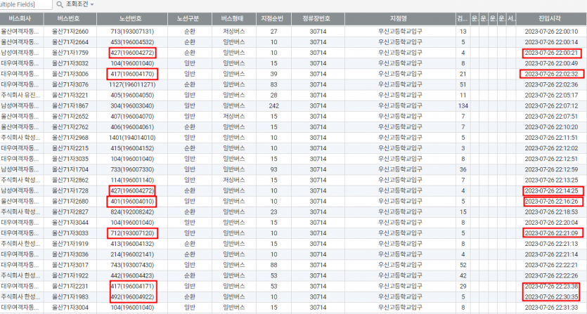 해당 7/26(수)에 우신고등학교 기준(율리 종점부터 위치 인식 시스템을 켜면 누락되는 경우가 종종 발생하기 때문에)으로 조회한 결과, 여러 대의 차량이 지나간 것을 확인하였습니다.