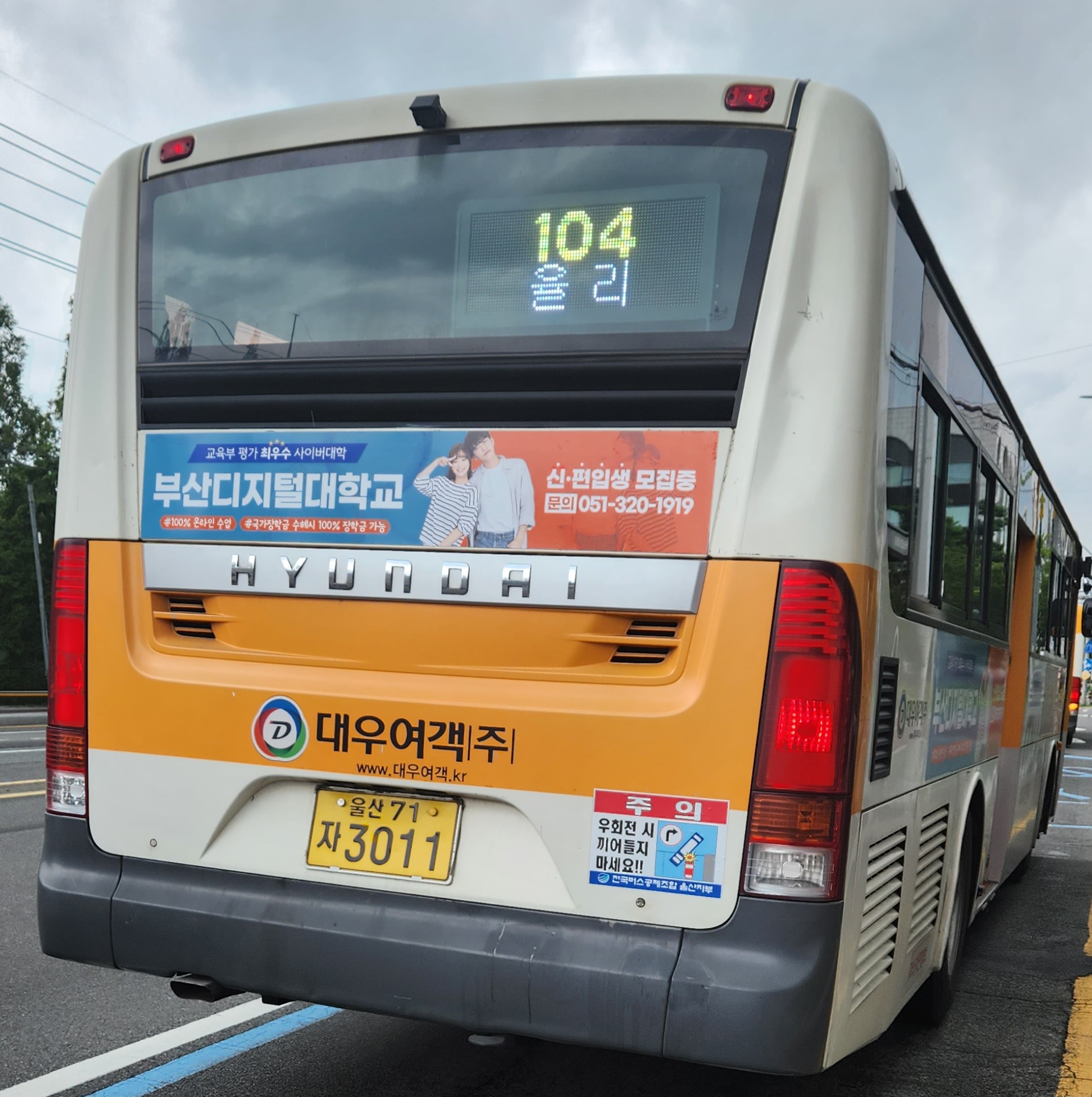 울산 71 자 3011 104번 버스가 버스 정지차선에 정차하지 않고 뒤에서 정차하여 탑승하러 갔으나 눈을 마주치고도 문을 닫고 승차를 거부했습니다.