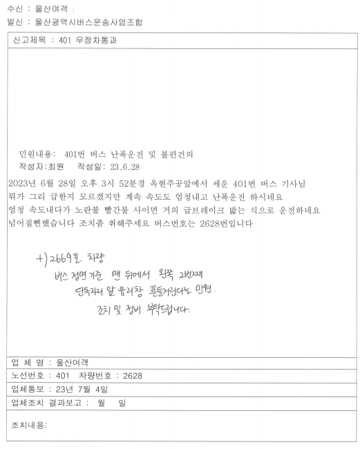 작성해 주신 2628호 민원은 운수회사(울산여객)에 전달하였으며, 운수회사에서 사실관계 확인 후 처리됨을 알려드립니다.
