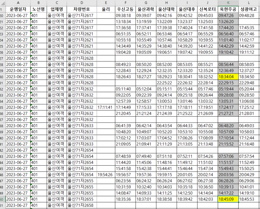 차량번호를 조회하는 과정에서 401번 25대가 하루 종일 순환하여 운행하는 운행기록을 추출하여 차량번호를 조회하는 점 양해 부탁드립니다.