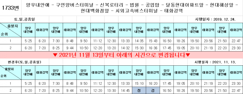 우선 먼저 알려드릴 점은, 1733번 토요일 시간표에는 14:35 양우내안애 출발 시간이 없음을 알려드립니다.