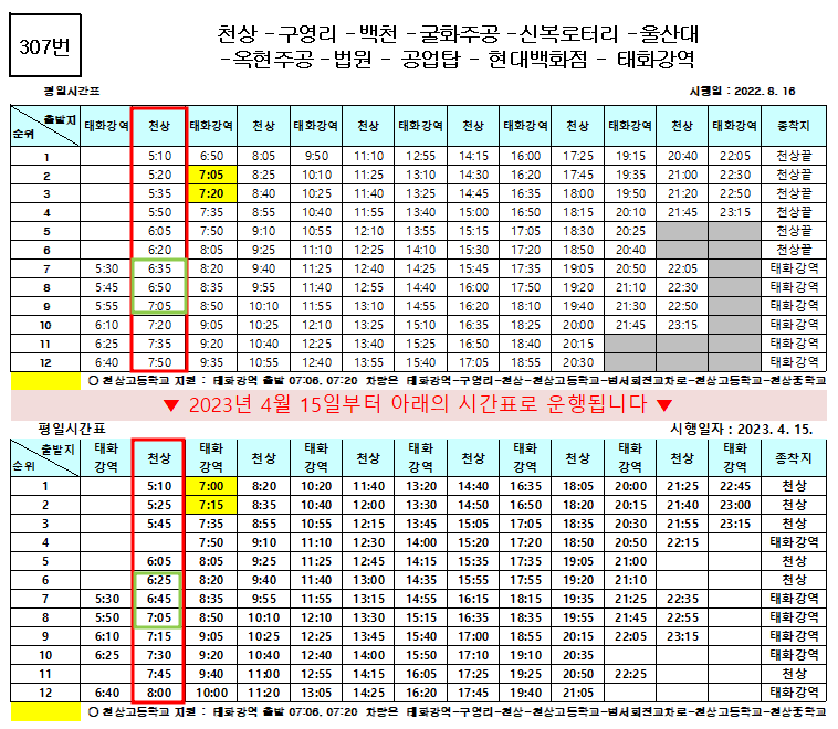 현재 천상 출발 시간이 06:25 /06:45/07:05 시간으로 변경되었기 때문에 06:45 변경된 천상 출발 시간을 지켜 정상적으로 운행하고 있는 것으로 사료됩니다.