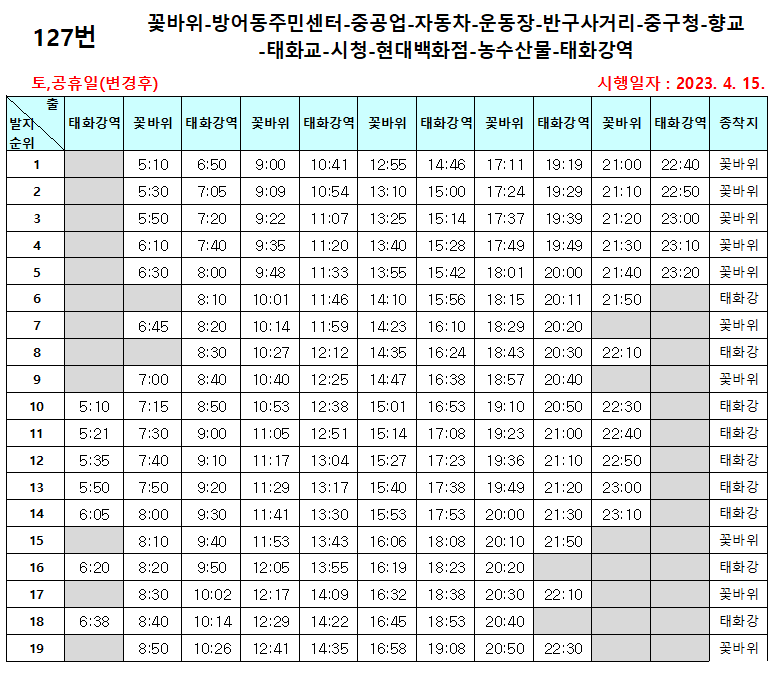 해당 127번 노선은 2023-04-15(토)부터 태화강역 출발 16:10으로 변경되었습니다.