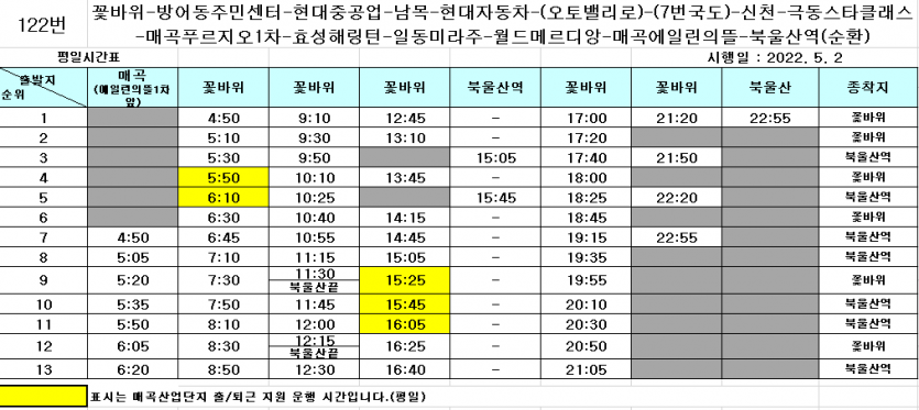 해당 122번 노선은 2022. 5. 2 부터 시행 중인 시간표입니다.