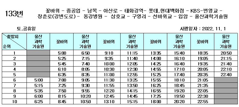 우선, 토요일 133번 노선 과학기술원 출발 마지막 차량은 22:40 차량이며, 해당 시간표는 2022-11-01부터 시행되었습니다.