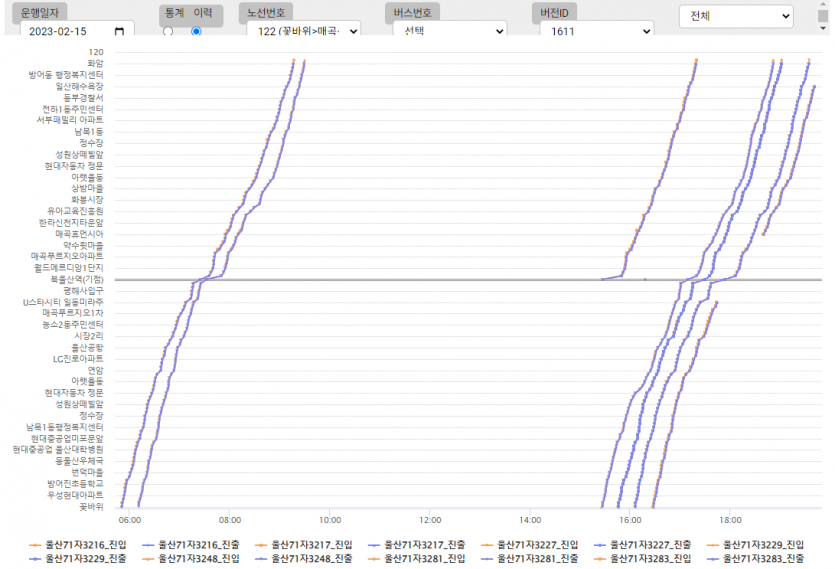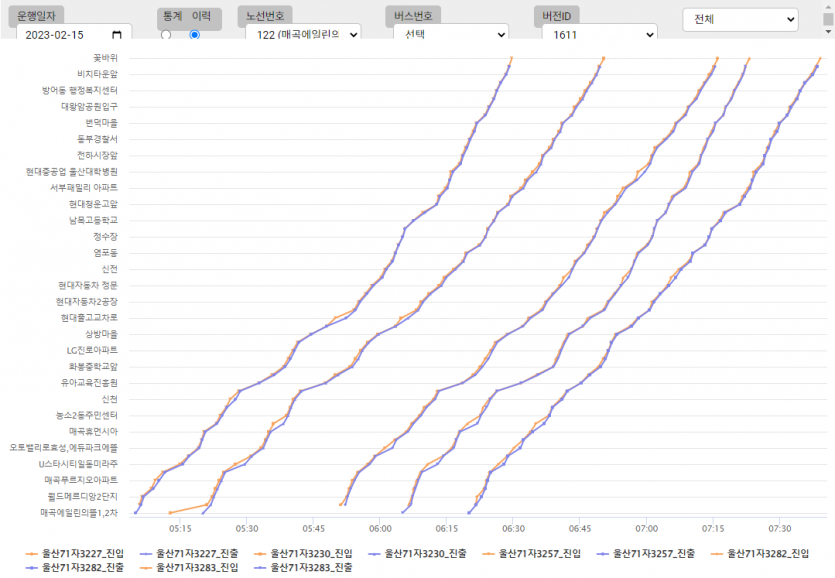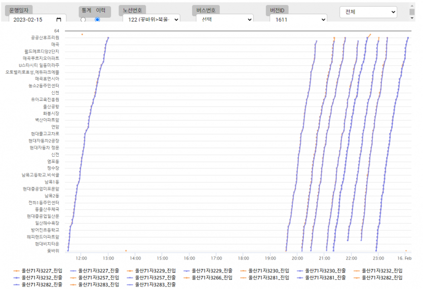 첨부한 운행기록상으로는 말씀하신 2023-02-15 날짜에 간격이 크게 벌어진 구간은 없으며, 특정 시간대와 정류소명을 정확히 말씀해 주시면 다시 상세히 분석해 보도록 하겠습니다.