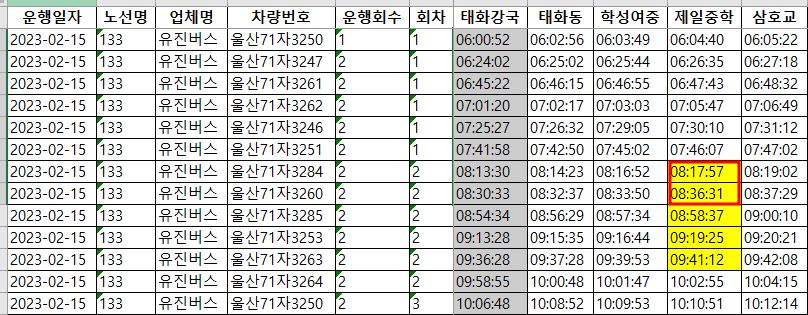 작성하신 내용과 관련하여 운행기록을 살펴본 결과, 2/15(수)에는 08:17, 08:36 경 지나간 사실을 확인하였습니다.